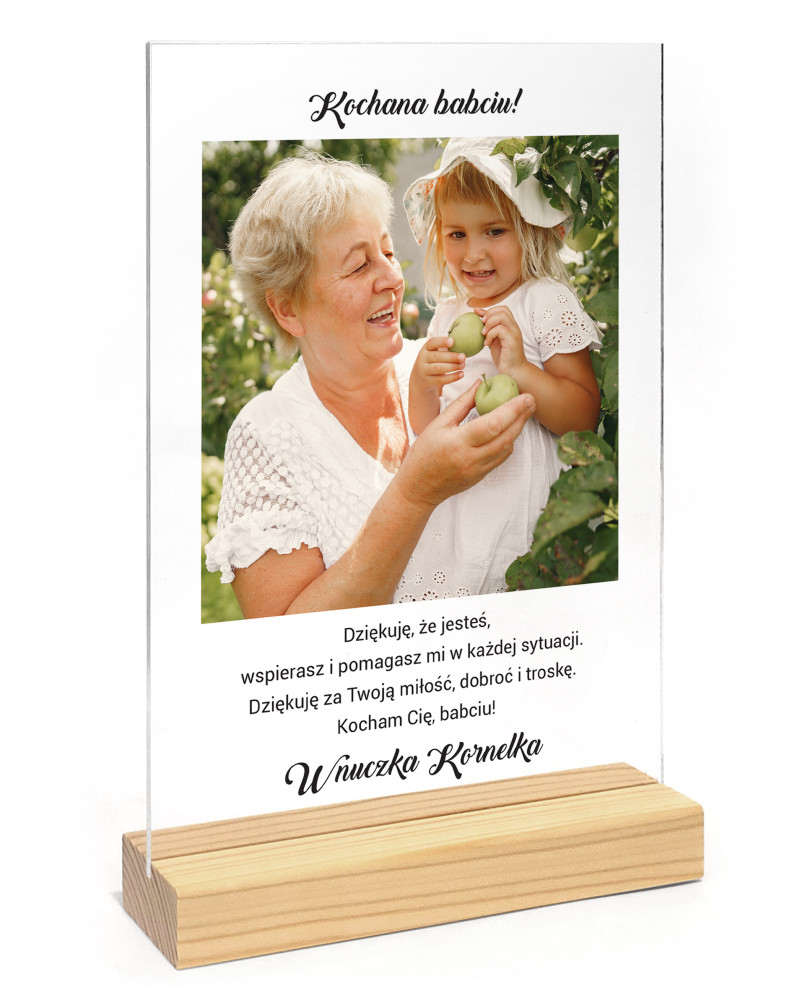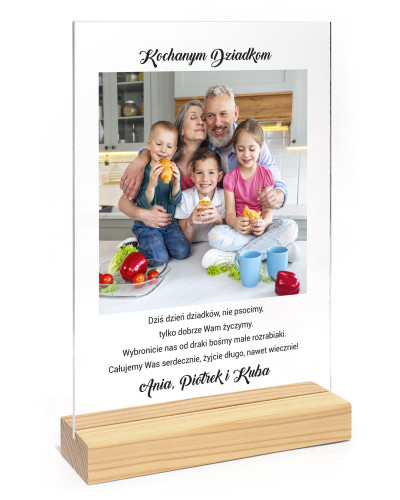 Na eleganckiej tabliczce ze stojakiem w kolorze naturalnego drewna widnieć będzie nie tylko przesłane przez Państwo zdjęcie, ale również życzenia dla dziadków.